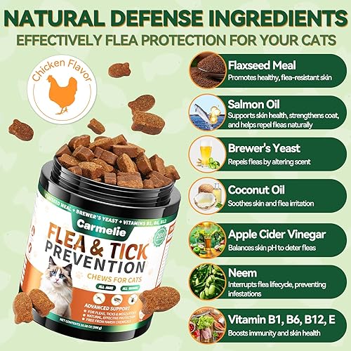 Natural Health Support: Carmelie’s flea and tick chews are made with natural ingredients like coconut oil, flaxseed, and brewer’s yeast, without harsh chemicals or artificial additives. Whether your cat is a playful kitten or a more relaxed senior, these chews are designed to support their overall health while effectively controlling fleas and ticks.