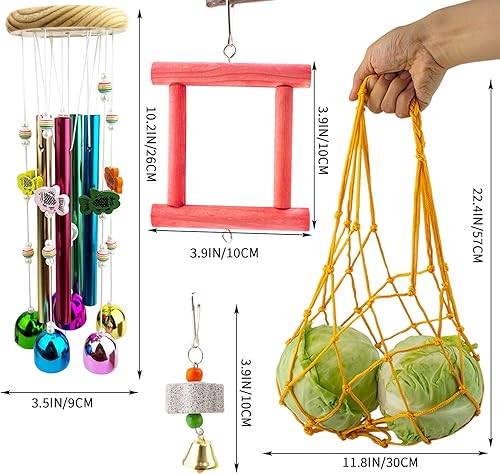 High-quality Materials: The chicken wind chime is made of high-quality metal tubes and large bells, chicken mirror is made of sturdy mirror with bell, Chicken Vegetable Bag is made of sturdy nylon rope, Chick Beak Grinding Calcium Stone is made of natural calcium stones. All toys are natural materials, safe, Can be used for a long time