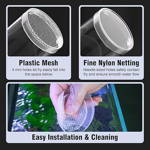Unique Mesh Design for Efficient Water Flow: The upper plastic mesh with larger holes allows fry to easily fall into the protective lower chamber. The fine nylon netting at the bottom features needle-sized holes, allowing smooth water flow while securely containing the fish. This mesh design ensures optimal water circulation and prevents fry from escaping, making it perfect for delicate species like betta and guppy
