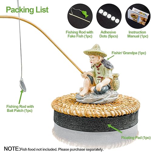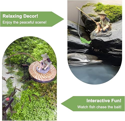2-in-1 Floating Decor: By day — A miniature floating Zen island with a contemplative fisherman. Feeding time — Watch it transform into an underwater chase scene! Secured bait creates lifelike 'fishing' action as fish strike.
