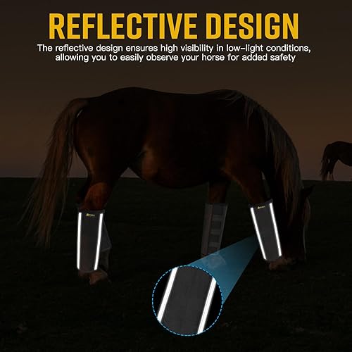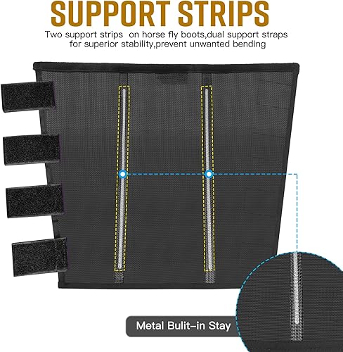 Special Design:Both sides have support strips and reflective bands on horse fly boots,dual support straps for superior stability,preventing unwanted bending.The reflective design ensures high visibility in low-light conditions, allowing you to easily observe your horse for added safety