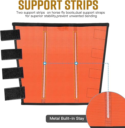 Special Design:Both sides have support strips and reflective bands on horse fly boots,dual support straps for superior stability,preventing unwanted bending.The reflective design ensures high visibility in low-light conditions, allowing you to easily observe your horse for added safety