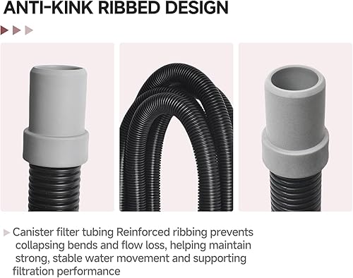 Anti-Kink Ribbed Design:Canister filter tubing Reinforced ribbing prevents collapsing bends and flow loss, helping maintain strong, stable water movement and supporting filtration performance