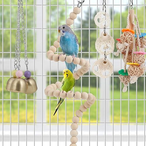 MULTI-FUNCTION BIRD TOY: The toys for bird include 8 pieces difference type bird entertaining toys to meet your bird various needs.Natural material toys and crisp bells sounds can attract the attention of pet birds,they are designed to let your bird's feet have rest while also offer exercise opportunities for your birds to keep healthy and fit. Provides your little bird an ideal elevated place to standing,climbing, playing, chewing, resting,etc. It's the perfect gift for your pet birds.