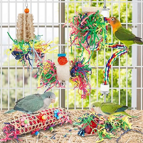 【Keep Active】:A busy Mr. or Mrs. bird is a happy Mr. or Mrs. bird.Those bird shredder toys are stuffed with brightly colored crinkly paper, which will catch bird's eyes immediately.And then they will pull them out just for great fun.It's a great chose to give your bird entertainment and physical exercise.