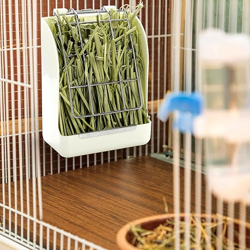 Humanized Design: The lip of the hay feeder is covered by stainless steel that can effectively prevents small animals from biting it. The garss rack has a spring mechanism that provides enough tension to fix the hay in the proper position and it is also removable that allow you to remove it for easy cleaning.