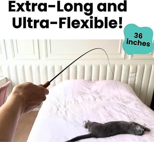 Comfortable, Play Longer, Play Better! With a comfy cork handle and extra-long 36” design, this cat toy wand is great for sitting, standing, or even lazy play. Bonus: wall mount included for tidy storage! Perfect for interactive cat toys for indoor cats and cat accessories that actually make life easier, for you and your cat.