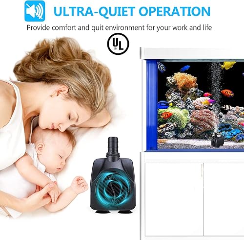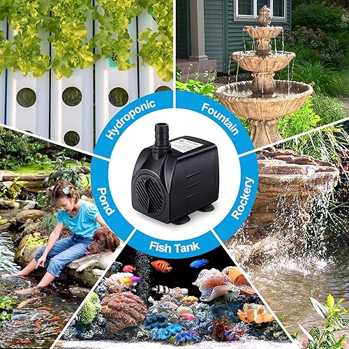 MULTI-OCCASIONS--The fountain pump can make circulation to your tank and give your lovely fish a near-natural environment. This submersible water pump can create water current, ideal for a medium-sized aquarium, small pond, water garden, and desktop water fountains. Perfect for backyard fountain/waterfall, aquarium, ponds, fish tank, tabletop fountains, garden statuary, patio drip irrigation system and hydroponic systems and more.