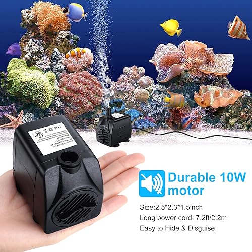 COMPACT BUT POWERFUL--The fountain pump’s compact design is easy to hide & disguise, 10W super efficiency motor continually lift water column. reasonable long power cord is heavy duty and easy to installation. The pump has 4 strong rubber suction cups at the bottom of the fountain pump help keep in your fish tank.