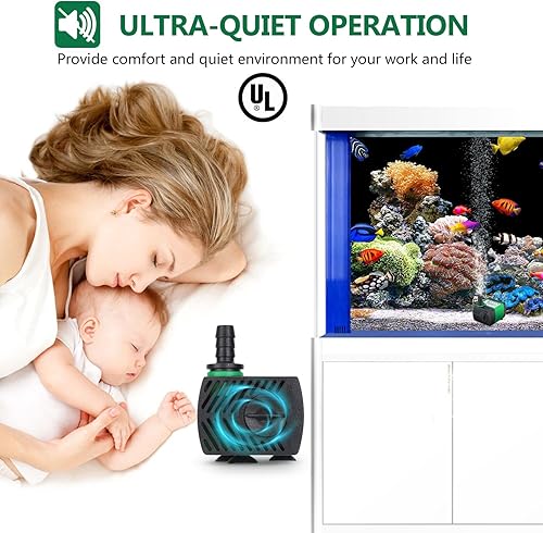 MULTI-OCCASIONS--The fountain pump can make circulation to your tank and give your lovely fish a near-natural environment. This submersible water pump can create water current, ideal for a medium-sized aquarium, small pond, water garden, and desktop water fountains. Perfect for backyard fountain/waterfall, aquarium, ponds, fish tank, tabletop fountains, garden statuary, patio drip irrigation system and hydroponic systems and more.