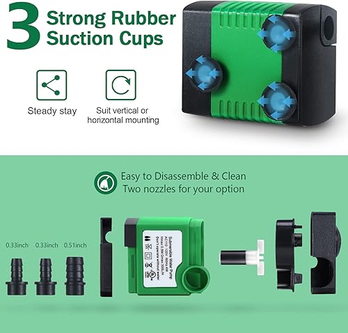 COMPACT BUT POWERFUL--The fountain pump’s compact design is easy to hide & disguise, 4W super efficiency motor continually lift water column. reasonable long power cord is heavy duty and easy to installation. The pump has 3 strong rubber suction cups at the bottom of the fountain pump help keep in your fish tank.