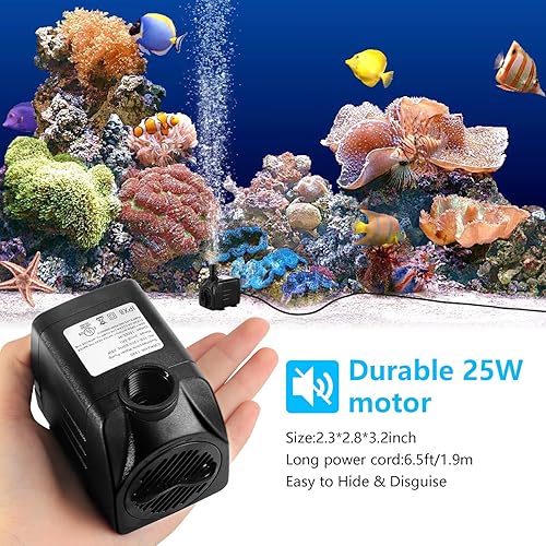 COMPACT BUT POWERFUL--The fountain pump’s compact design is easy to hide & disguise, 25W super efficiency motor continually lift water column. Reasonable long power cord is heavy duty and easy to installation. The pump has 4 strong rubber suction cups at the bottom of the fountain pump helps keep in your fish tank.