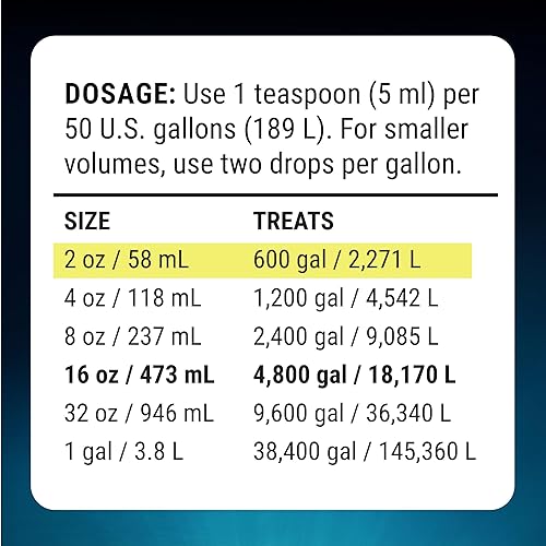 Concentrated, easy to use formula: one teaspoon (5 ml) treats 50 gallons, or about 2 drops per gallon. May be added directly to aquarium.