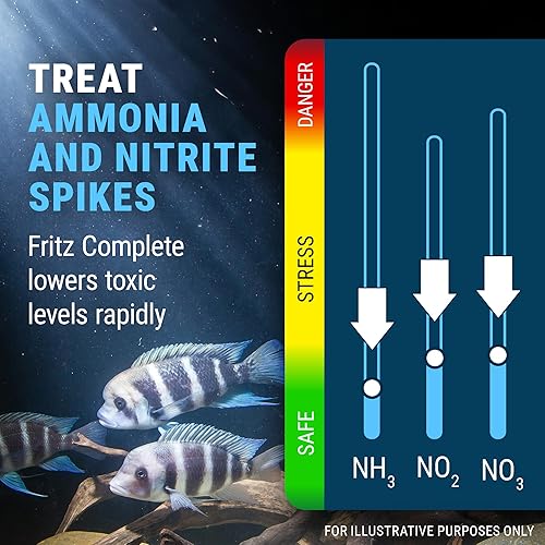 Use to alleviate ammonia and nitrite spikes: Fritz Complete lowers toxic levels of ammonia and nitrite rapidly, reducing fish stress.