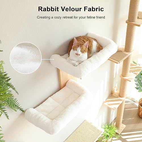 CAT SHELVES WITH 2 BEDS - Cozy up your cat with rabbit velour fabric bed, as soft as a cloud. It's ergonomically made for head and neck support, promising a restful sleep. The cushion is also removable and machine-washable for easy care.