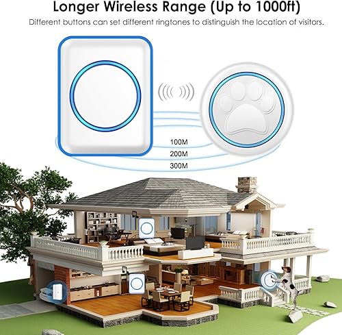 [Long-Range and Customizable] - Operating range is 1000+ feet in open area. The receiver offers a selection of 52 different ringtone options, and adjustable volume ranging from 0 to 110 decibels. You can easily add or remove receivers and customize a unique ringtone for each button.