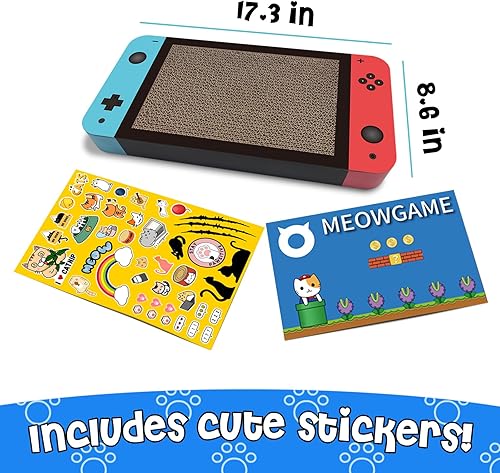 Package Includes - 1 gaming cat scratcher, 1 sticker sheet, 1 meowgame “card”. Dimensions: 17.3 x 8.6 x 1.9 inches. Weight: 1 pound.