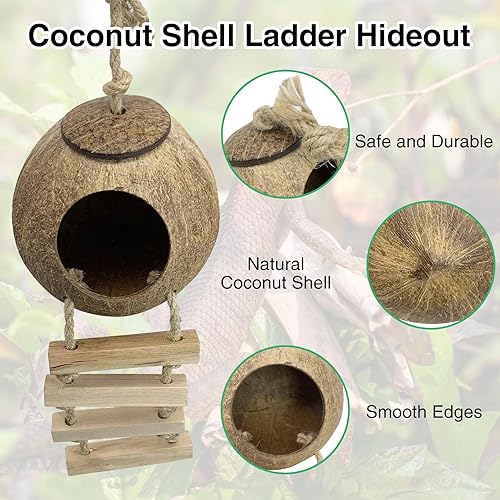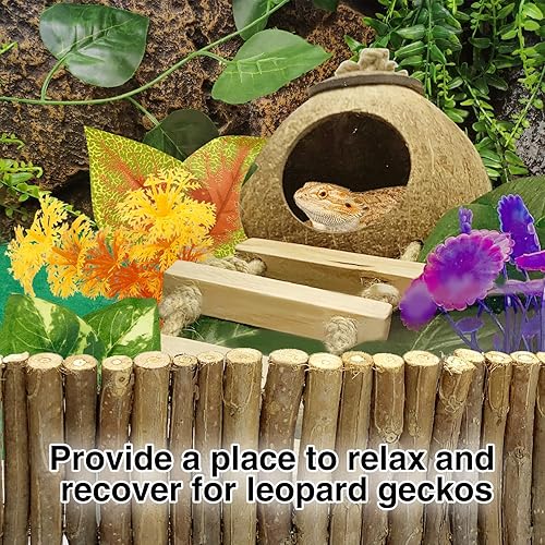 SUITABLE FOR INDOOR AND OUTDOOR --- As a leopard gecko tank accessories, you may spot it sleeping inside it. Along with being a shelter for your lizards, the hanging coconut shell and reptile vines are also a very beautiful yard accent for your garden or on your porch to attract pretty birds