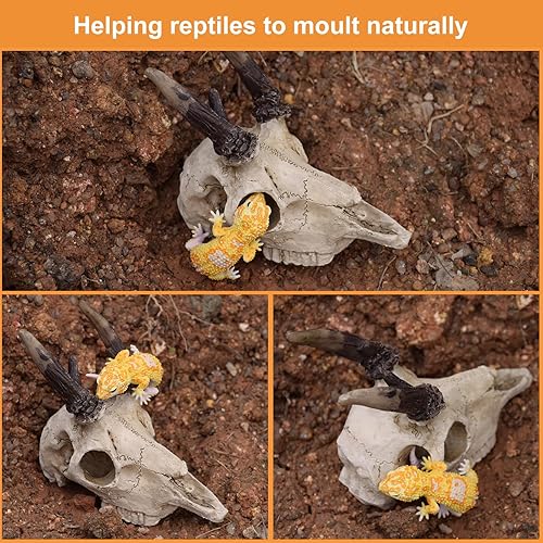 1.PRODUCT SAFETY IS MOST IMPORTANT: Our this Elk Skulll Decoration is polished and will not harm your pet's skin or scales, very safe. The irregular antlers and small holes can help lizards, leopard geckos and snakes better complete their natural moult.