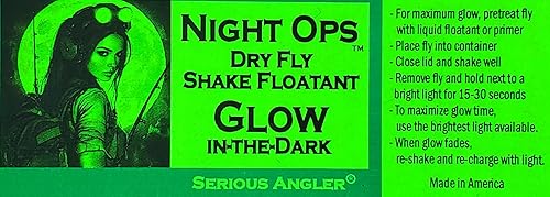 Once flies become water logged and/or glow fades, squeeze away excess water, false cast to dry or prime again {as you would with any fly} shake fly in Night Ops and use your HIGHEST Lumen light and light up your fly.