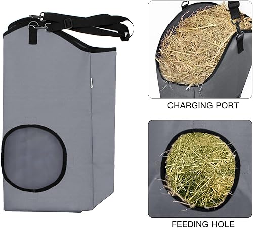 Specifically designed for storing hay and feeding goats, this hay feeder bag is also suitable for horses, donkeys, cattle, and other livestock. Its large top opening makes loading hay a breeze. Whether you hang it indoors, outdoors, on trees, in corrals, or pastures, this versatile bag is a reliable choice for convenient feeding
