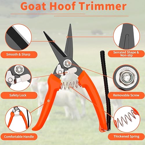 【Sharp and Strong】: Goat hoof trimmer made of high-quality stainless steel and plastic, hard and rust-proof. The semi-serrated surface prevents slipping, and the thick spring can automatically and quickly open, making it efficient and labor-saving