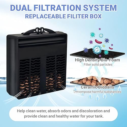 【EASY INSTALLATION】 Setup quick and easy remove, our turtle water filter comes with four suction cups to fix the it on smooth tank surface. Suitable for any aquarium tank up from 10-30 gallons.