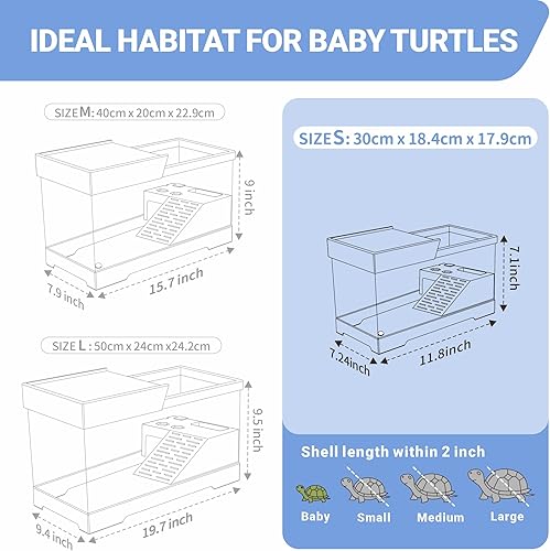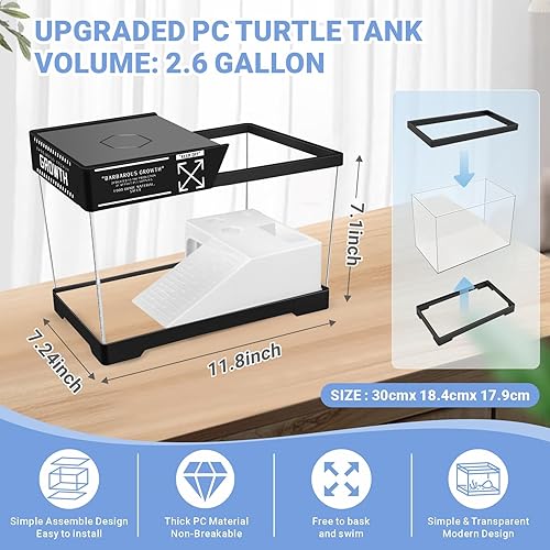 [360° TRANSPARENT DESIGN FOR VIEWING] Constructed from fully transparent PC panels, our turtle cage allows you to enjoy a clear 360° view of your pets and their environment. Besides it has elevated lid not only enlarge tank space for living but also prevent your pet escape.