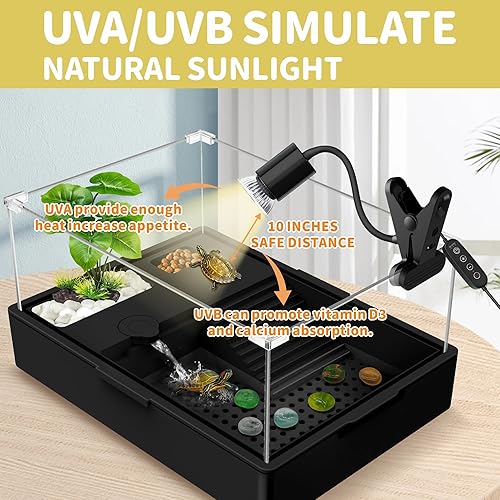 【Guidelines for Safe Usage】Please be noted that the turtle light should be left on for a minimum of three to five hours per day. Do not turn on the lamp immediately after turning it off. When operating the lamp, please ensure do not touch the lamp to test the temperature. Besides, adjust the distance between the heat lamp and the pets prevent over heat.