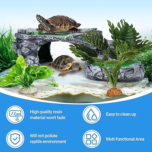 【SIMULATED NATURAL ENVIRONMENT】Cave design offer the natural environment feeling.We polish every sharp edge of turtle basking platform to avoid hurting your hand and your lovely pets.