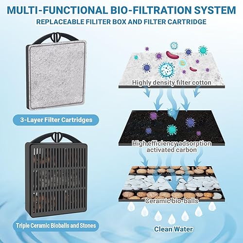 【SAFTY OPERATION】Ensure that the water level in the tank is always above the filter's inlet at least 1.38 inch during operation. Keep water level above the water inlet area to reduce noise and prevent dry-burn. Please regular clean up the cartridge and filter box to prolong the service time. For optimal performance please replace the new filter cartridge 1-2 weeks and the filter box every 2-3 weeks (Product Asin: B0DK4S995Z in store ).