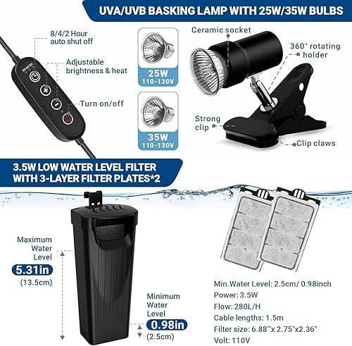 [3.5W TURTLE TANK FILTER + 2 FILTER CARTRIDGES] 3.5W water filter keeps the water clean. Please hang the filter with a hook and back suctions to stabilize it. Filter motor maintenance: please replace the filter cartridge and rinse motor regularly to remove debris every 1-2 weeks.