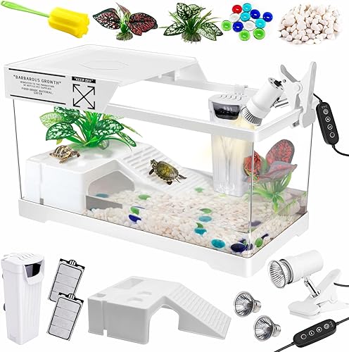 [TURTLE TANK KIT & FULL ACCESSORIES] GOZILLA turtle tank starter kit one set including:1*tank,1*lid,1*drainage rubber,1*sponge brush, 2*decorative plants,1*basking platform with parts,1*bag of natural rocks, 1*bag of colored beads,1*lamp with 2*bulbs, 1*filter with 2*filter plates, and 1*manual. Save your time to purchase all these accessories separately.