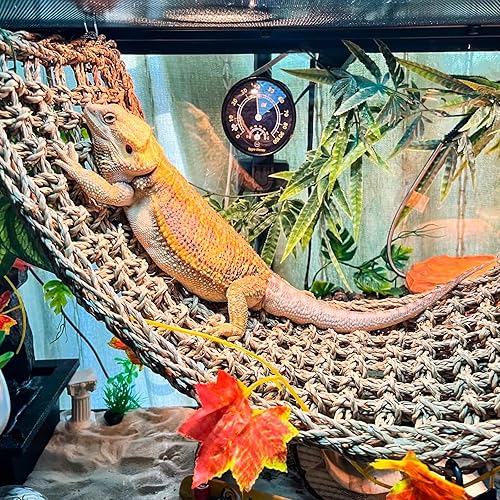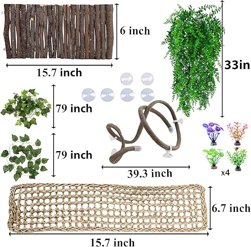 【9 Pieces Dimensions】Bearded dragon tank accessories:1X reptile bridge – 15.7x6 inch; 1X hanging plants- 32 inch; 1 X jungle vines – 39.6 inch; 1X leaves -79 inch;1X bearded dragon hammock 15.7 X 6.7 inch; 4 x stand plants-3.9 inch The terrarium vines are bendable, life-like vines with a natural feel and look and can be twisted together with vines of different sizes to create a 3-D habitat.
