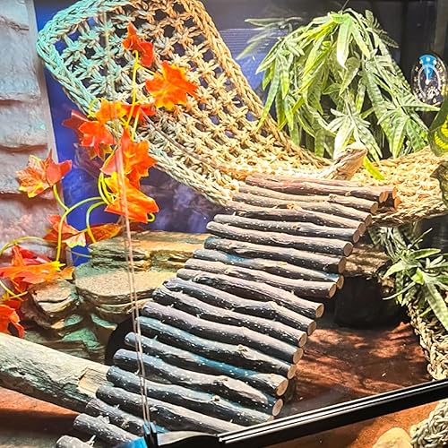【Safe Material】Reptile bridge is made of natural wood material. The reptile vine is made of iron wire inside and soft PU material outside. Reptile hanging plants is made of plastic.