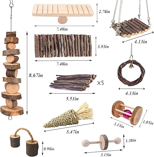 【Package Include】Our Guinea pig toys set includes 1x apples wood ladder bridge(Size: 7.8*3.9inch), 1x apples wood molar string(Length: 8.6inch), 5x apple wood sticks and 1x grass woven carrot(Length: 5.4inch),3x timothy hay sticks,1x seesaw(Size: 7.4*2.7inch),1x pentagram(Length: 2.6inch). Handmade products may have dimensional errors.