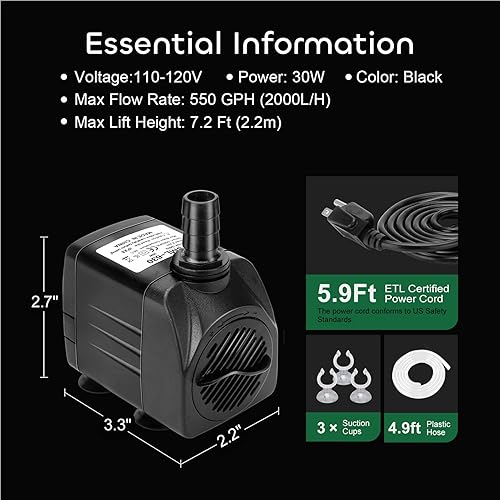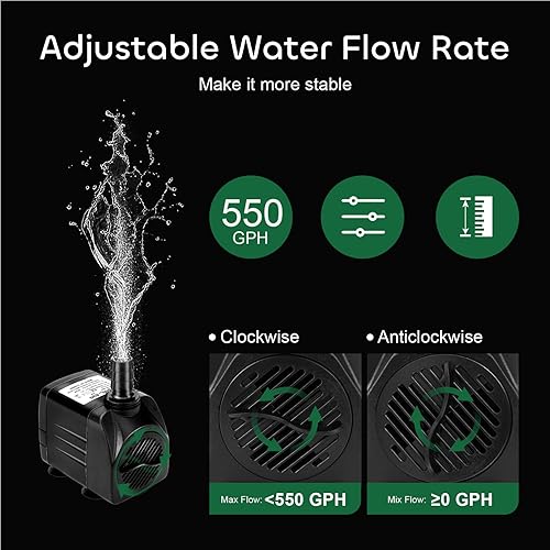 UL CERTIFIED & WATER FLOW CONTROL -- Our water pump meets UL 1081 standards. The adjustable knob controls the water flow so you can get the water pressure you want. The maximum flow: 550GPH (2000L/H)