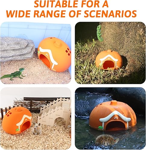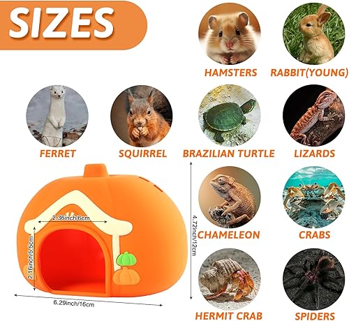 Perfect for Small Animal: Pumpkin Shape: Measuring 6.3" x 4.7" x 4.5" (D*H*W) with a 2.4"x2.2 "entrance diameter; Stump Shape: Measuring 6.3" x 4.7" x 4.5" (D*H*W) with a 2.4"x2.2 "entrance diameter; Our hamster hide offers plenty of room for Ferret, Chinchilla, Bunny, Squirrel, Tortoise, Lizard and other small animals to rest and relax.