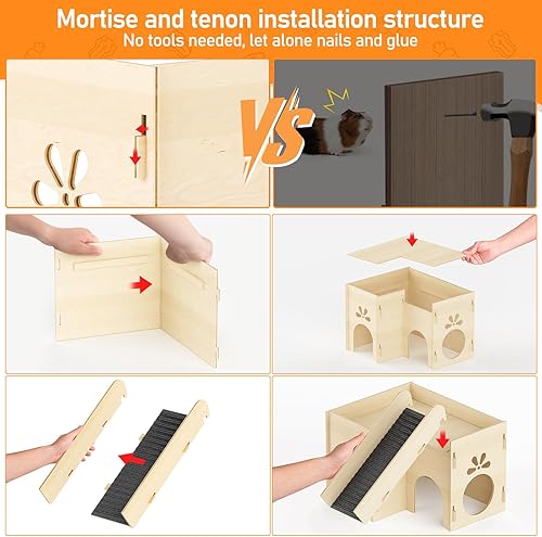 Easy Assembly & Cleaning: All boards can be inserted through mortise and tenon structure, without the need for extra nails or glue. The instruction manual reveals the naming and installation sequence of each component. The video on the link will also introduce how to install hamster house. Features detachable components, easily separate levels and ramp for quick wipe-downs, no more struggling with fixed structures.