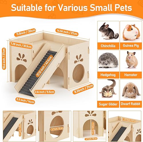 Ultimate Guinea Pig Paradise: Spacious multi-level guinea pig hideout provides essential hiding spots, climbing fun, and a secure lookout platform, satisfying your pet's natural instincts to explore and feel safe. Your little pet can sleep peacefully or store their precious food at hiding points. Through the design of multiple exits, they can run freely in the hamster hide while enjoying high air circulation. And experience climbing fun and a secure lookout platform by climbing up the ladder.