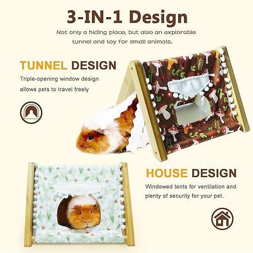 Safe & Durable & Fun: The triangular structure of the guinea pig house provides excellent stability and is not easily deformed or collapsed. The guinea pig tunnel is made of 2cm thick bamboo, finely polished by hand, burr-free and durable. Innovative dual-channel intercommunication structure with visual ventilation windows perfectly simulates the ecology of small animals' field burrows, which not only meets the instinctive needs of guinea pigs, hamsters and other small animals to explore by drilling holes, but also avoids the depressing feeling of closed space. It can observe the interesting dynamics of cute pets from multiple angles and enhance the fun of human-pet interaction.