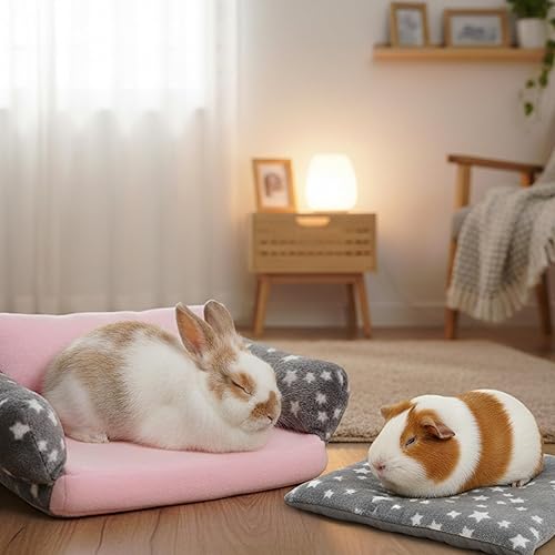 SIZE: Pet sofa dimensions are 12" x 9.4" x 3.7" (L x W x H); pet mat dimensions are 11.8" x 9.4" (L x W x H). Suitable for most small animals, such as guinea pig, hamster, hedgehog, rabbit, bunny, ferret, kitten, etc. (Tips: Due to packaging, the sofa may have some size deviations. This will gradually return to normal after use. Thank you for your understanding.)
