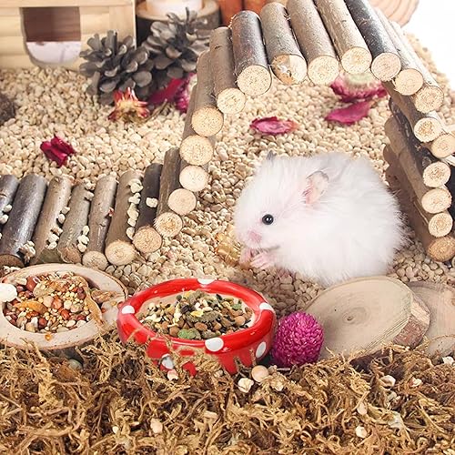 Comfort & Safety: The ceramic hamster hide bed is cool in summer and warm in winter (add cotton bedding for extra coziness). The water bottle with stand provides fresh water for your pets without leaking. The shallow food dish is easy to refill, not ideal for much foods.