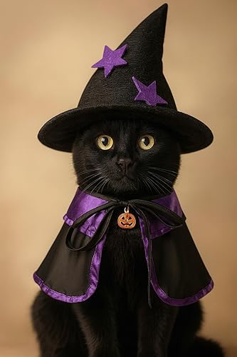 Celebrate Halloween with Your Furry Kitty – Dress your beloved cat in this adorable witch costume featuring a black and purple cloak with a cute pumpkin charm and a matching wizard hat decorated with purple stars. Make your kitty the magical star of the holiday!