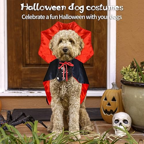 VAMPIRIC ELEGANCE WITH TAIL MOBILITY: The Halloween dogs cats costume boasts a neckline crafted with an exceptional composite cotton reinforcement technique, resulting in a stunningly beautiful and dimensional appearance. Incorporating a tail-friendly triangular cutout, this design ensures your cat or dog's tail can wag freely without compromising the fit of the cape. The red stand collar and black cape combination creates a delightful vampire elf aesthetic, adding joy and excitement to your pet's Halloween experience, all while keeping the cloak securely in place during every playful moment.