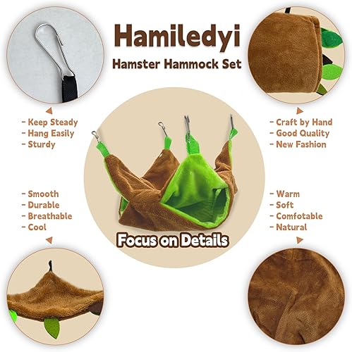 UNIQUE DESIGN : Hamster hanging bed is designed like a stump with holes for your pets to get in and out.And there’s a long cableway,more like their natural homes.Two triangle hammocks for pet climbing fun.There is also a round swing to keep the hamster busy.Small animal will find comfort staying in