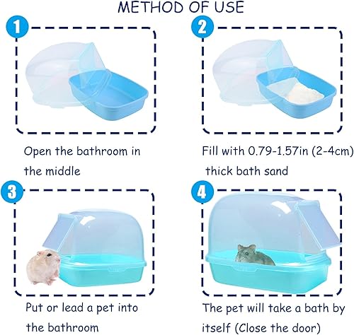 【Package includes】A 2 LB bag of bath sand, a chinchilla bath room 9.65 x 6.89 x 7.09 inches(24.5*17.5*18 cm L*W*H),Ideal for Syrian dwarf hamsters, squirrels, chinchillas, guinea pigs and other small animals.Please note that the bathroom is relatively small, and it isn't fit for adult rabbit or relatively large rats