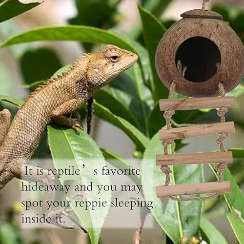 SUITABLE FOR INDOOR AND OUTDOOR : Lizard Coco Den with ladder is crested Lizard’s favorite hideaway and you may spot it sleeping inside coconut hut. Along with being a hideout for your Lizards inside of their habitat, the other one hanging coconut hide is also a very beautiful yard accent for your garden or on your porch to attract pretty birds. If you are planning to place coconut hide on the ground in your front or backyard, get ready to listen to the musical call of frogs