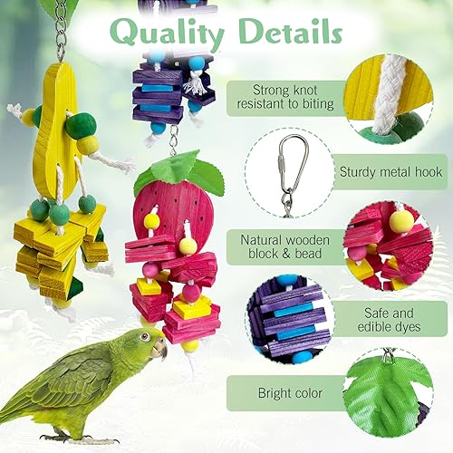 UNIQUE FRUIT OUTLOOK DESIGN : In order to bring more fun for your little further friend,we’ve designed four fruit outlook chewing toys with distinctive shapes and wooden beads,which can encourage your parrots to climb and explore,just get one for your lovely one