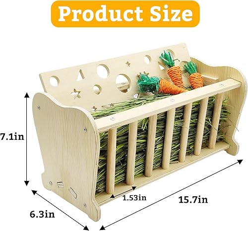 Special Design : Wooden rabbit hay feeder has 2 sides to allow more pets to eat at once. The hay rack for rabbits is made of high-quality wood material that will bring your pet closer to nature. The hollow starry sky design on the top can insert carrots celery, parsley, fresh twigs, etc to increase the fun of pets foraging